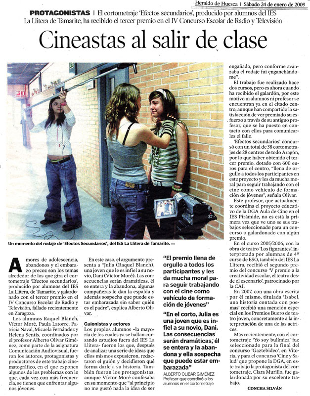 Amores de adolescencia, abandonos y el embarazo precoz son los temas alrededor de los que gira el cortometraje «Efectos secundarios« realizado por los alumnos del IES La Llitera y galardonado con el tercer premio del IV Concurso Escolar de Radio y Televisión, fallado en Zaragoza.