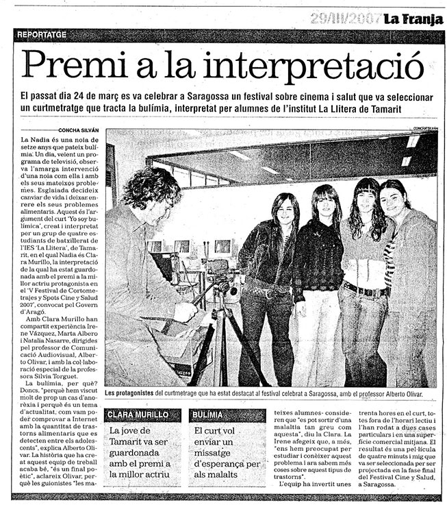 El día 24 de marzo de 2007 se celebró en Zaragoza el Festival Cine y Salud donde se seleccionó y premió el cortometraje, que trata sobre la bulimia, interpretado por los alumnos y la alumnas del IES La Llitera de Tamarit. Clara Murillo recibió el galardón a la mejor interpretación.